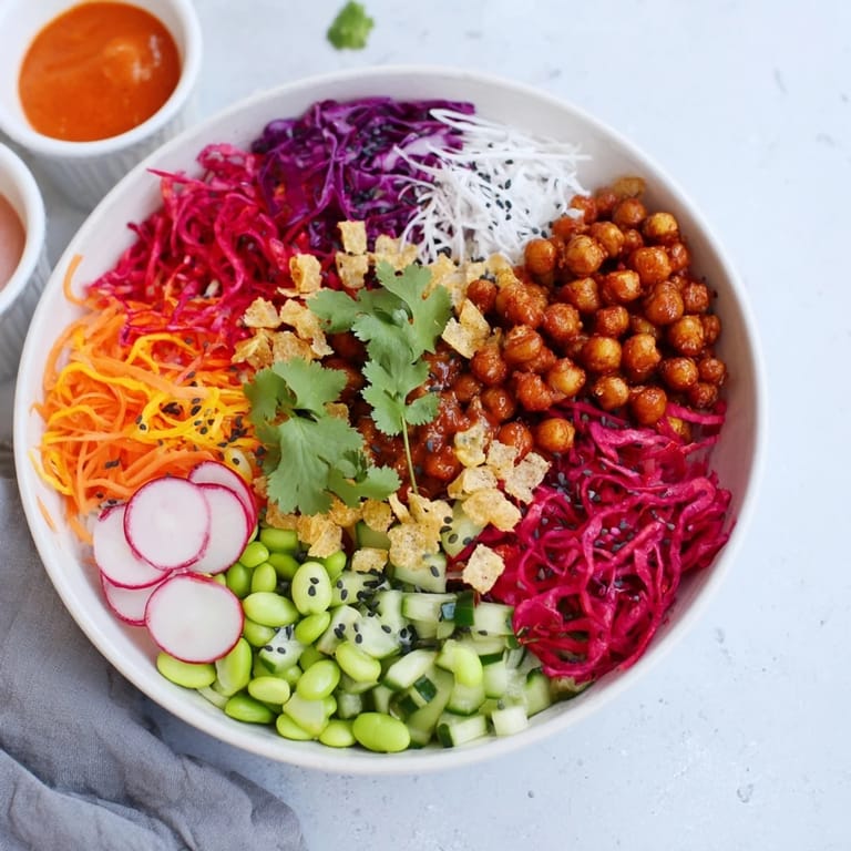 - Top each bowl with roasted chickpeas, crispy rice puffs or cornflakes, toasted pumpkin seeds, and sliced radishes.