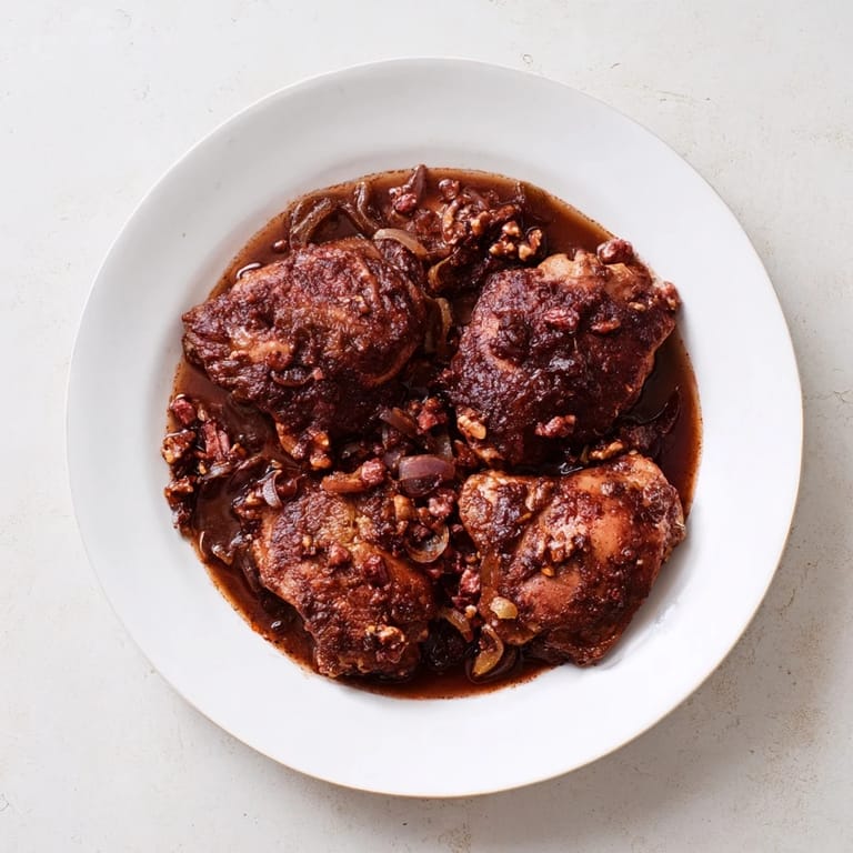 Save A rich, tangy-sweet Persian stew featuring tender chicken thighs simmered with walnuts and pomegranate molasses, offering classic flavors on a budget.