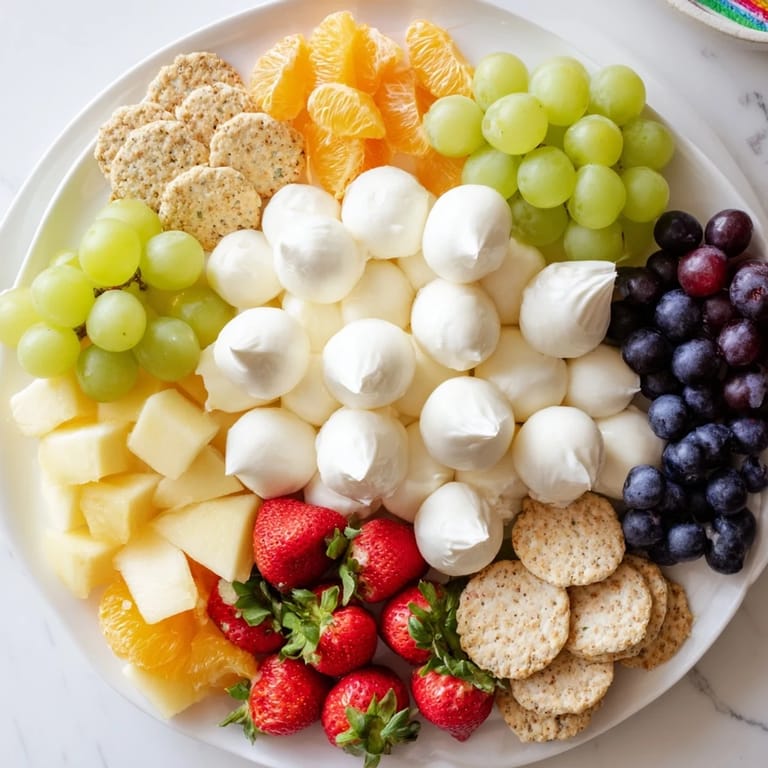 - Fruits (Rainbow Colors): 1 cup strawberries hulled and halved, 1 cup clementine or mandarin segments, 1 cup pineapple chunks, 1 cup green grapes, 1 cup blueberries, 1 cup purple grapes or blackberries, ½ cup raspberries optional for extra color