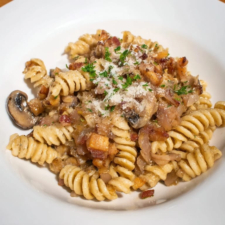 Save A hearty, budget-friendly pasta dish featuring crispy bacon, sautéed onions, and earthy mushrooms tossed with fusilli in a light, savory sauce.