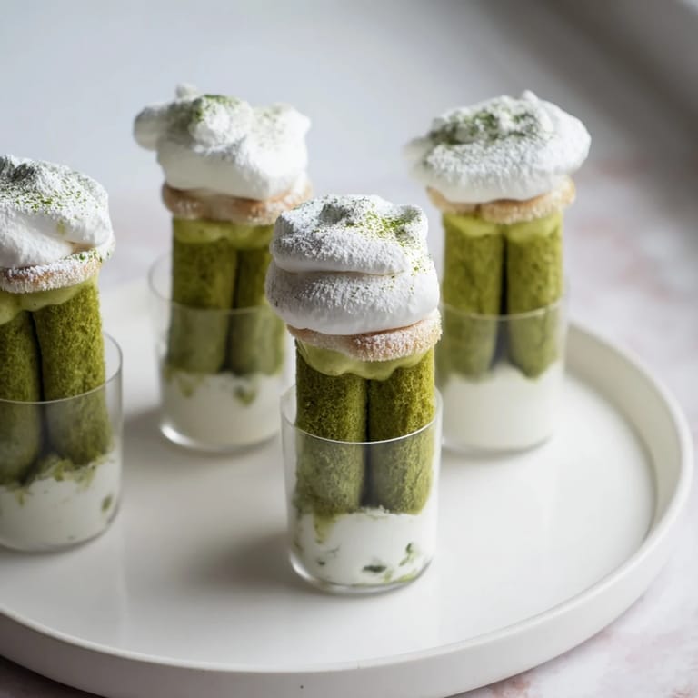 Save A delightful fusion dessert featuring layers of airy matcha-soaked sponge, creamy mascarpone, and a snowy dusting of matcha. Perfectly portioned in cups for a refreshing twist on the classic Italian tiramisu.