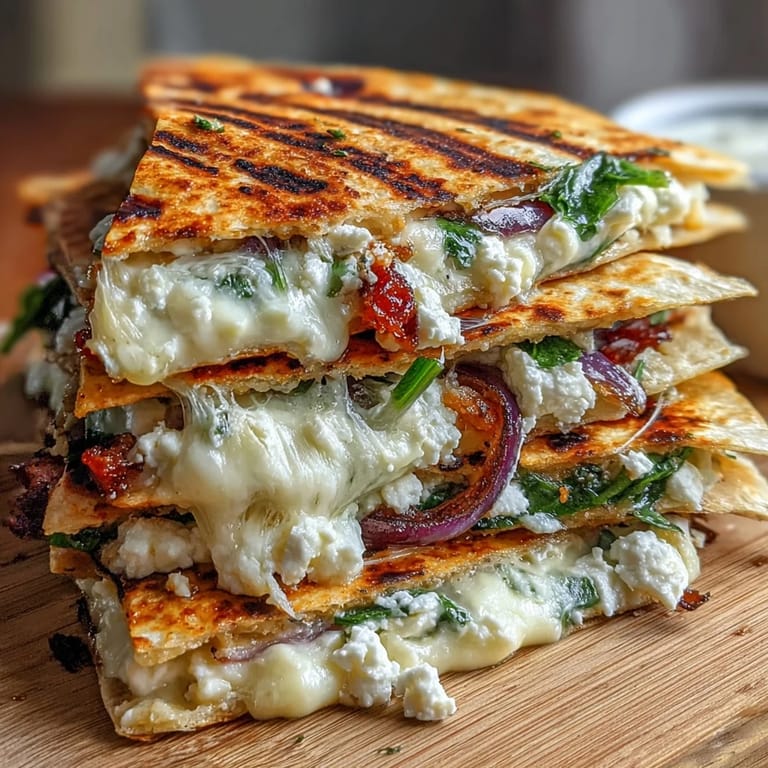 Save The first time I made these Mediterranean quesadillas was on a rainy Tuesday when I wanted something different than the usual dinner routine. I had a wilting bag of spinach and some feta that needed using, and suddenly quesadillas sounded like the perfect comfort food experiment. The way the salty feta melts into creamy mozzarella while the red onions sweetens up in the heat creates something completely unexpected and wonderful.