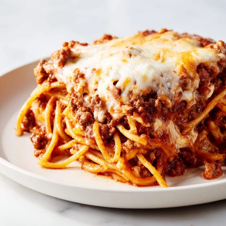 Spaghetti is used, cooked to al dente before layering.