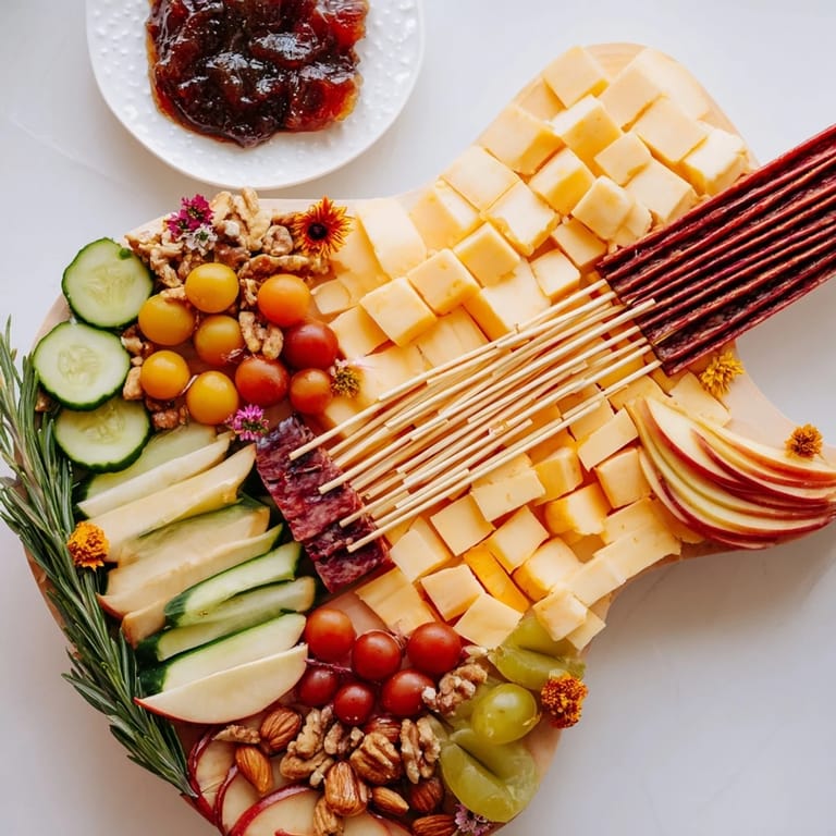 Save A bold, show-stopping party platter inspired by rock concerts, featuring a medley of crowd-pleasing snacks, cheeses, cured meats, and crunchy bites arranged in the shape of a guitar for maximum visual impact.