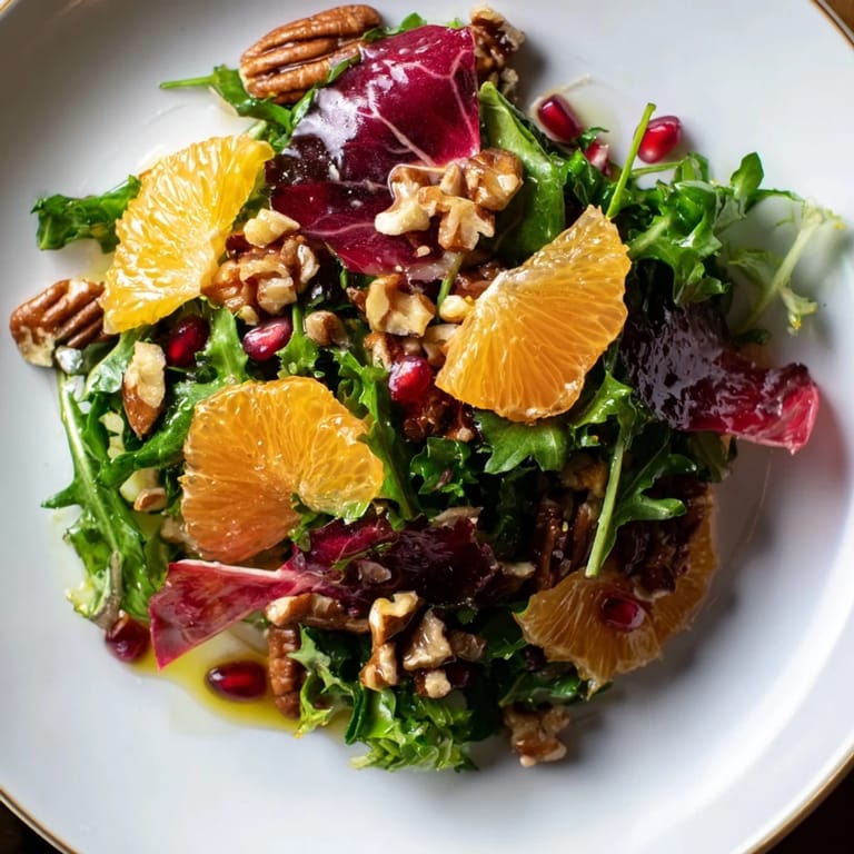 Save A vibrant refreshing salad featuring hearty winter greens juicy citrus ruby pomegranate seeds and crunchy toasted nuts perfect for brightening cooler days.
