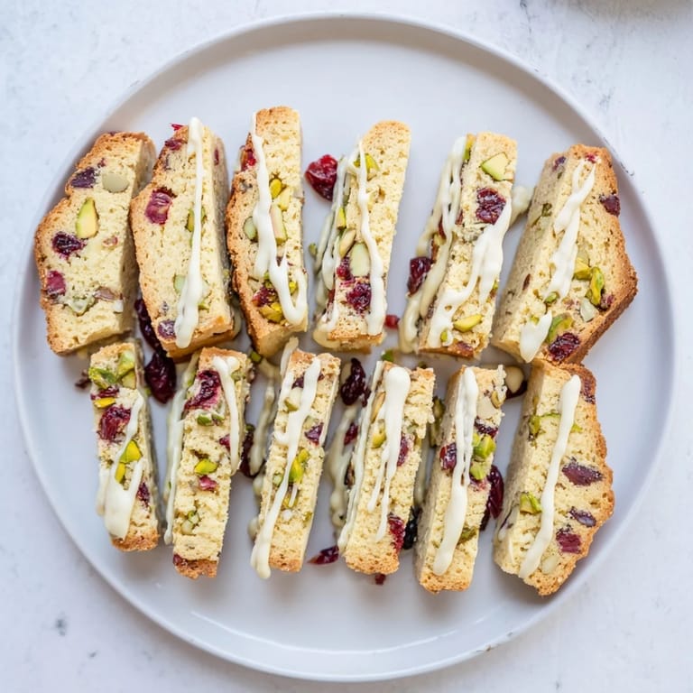 Save Crisp, twice-baked Italian cookies studded with tart cranberries, crunchy pistachios, and creamy white chocolate. Perfect for dipping in coffee or gifting during the holidays—no dough chilling required!